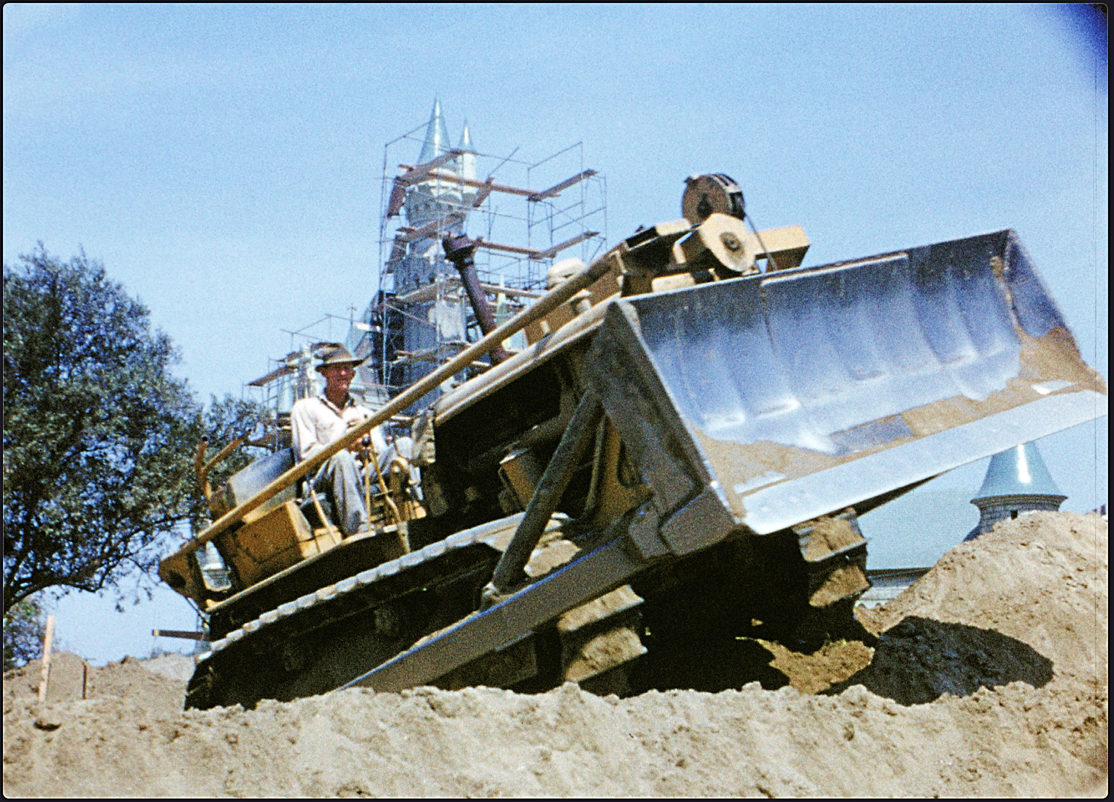 Above is a photo of a construction worker driving a bulldozer during the creation of Disneyland in Disneyland Handcrafted. Photo by Disney and used under the fair use provision.