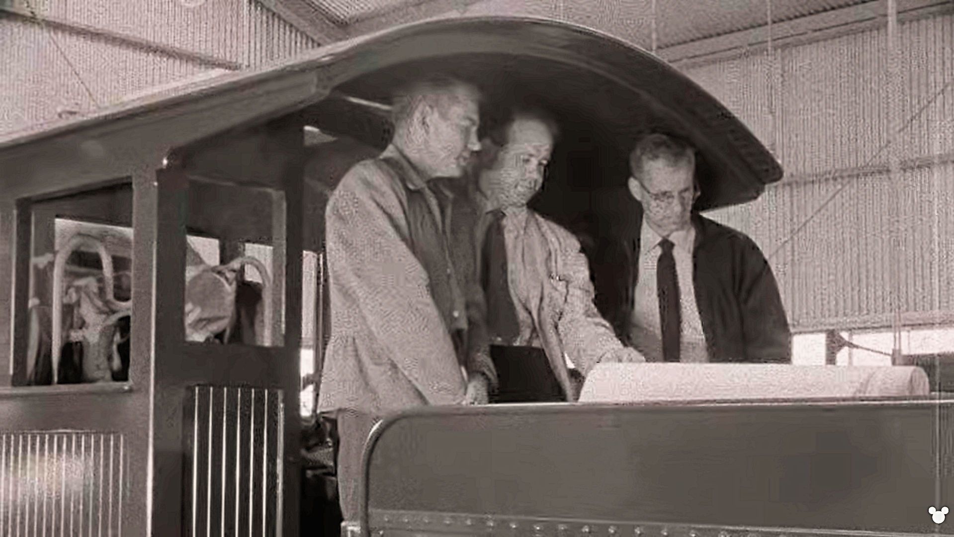Above: Roger E. Broggie working on designing the steam train for Disneyland in Disneyland Handcrafted. Photo by Disney and used under the fair use provision.